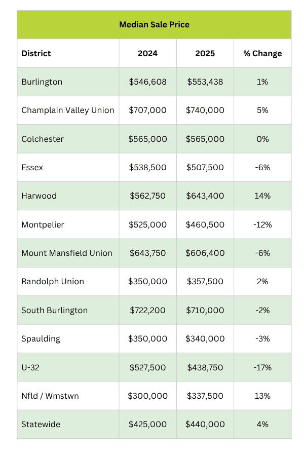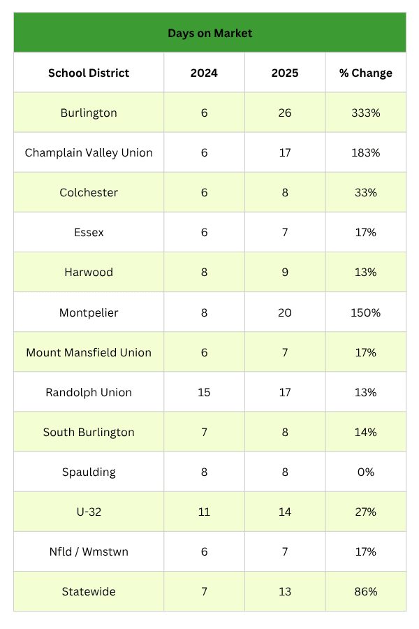 For Vermont, median days on market was up 86%, ranging from an increase of 333% to a decrease of 0%. That’s right…across the state, it’s taking almost twice as long for homes to sell than it did this time last year. **Spoiler alert! Burlington single family homes took 333% longer to sell, from 6 days in 2024 to 26 days in 2025.